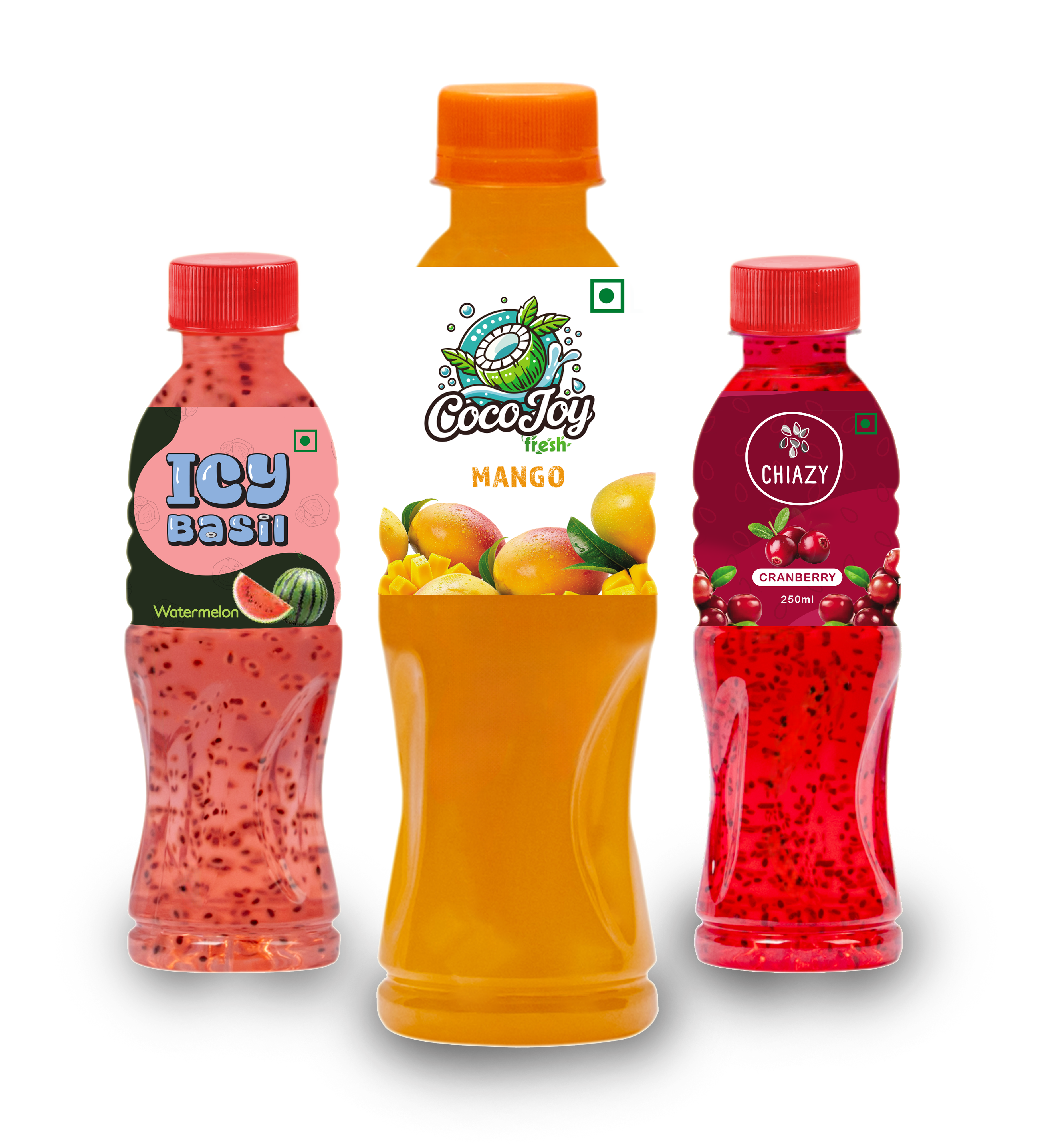 Unique product range, including basil seed, juice, Chia seed juice, Coco jelly juice, and aloe vera juice.
